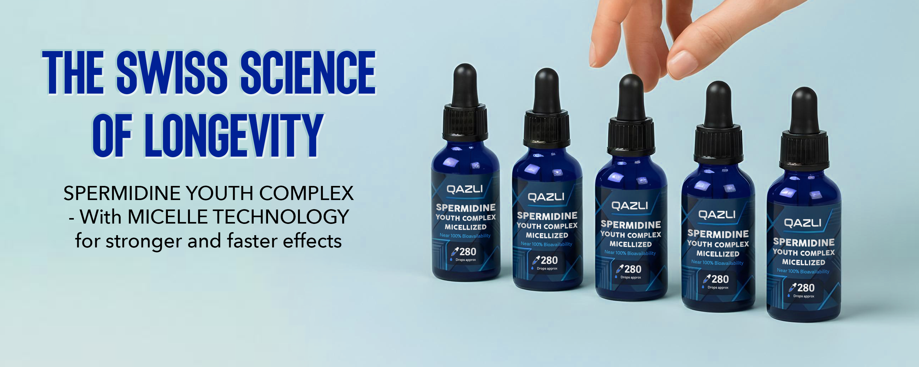 QAZLI Spermidine Youth Complex with Micelle Technology regulates a wide range of biochemical and physiological aging processes and prolongs a healthy lifespan.